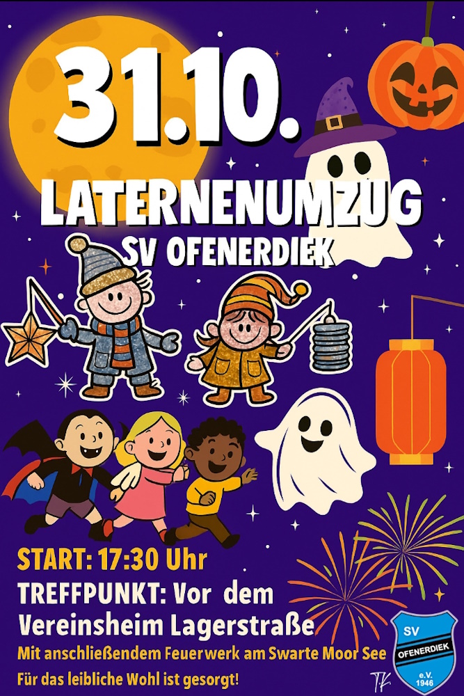 Der SV Ofenerdiek veranstaltet am 31.10.2025 ab 17:30 Uhr seinen alljährlichen Laternenumzug.